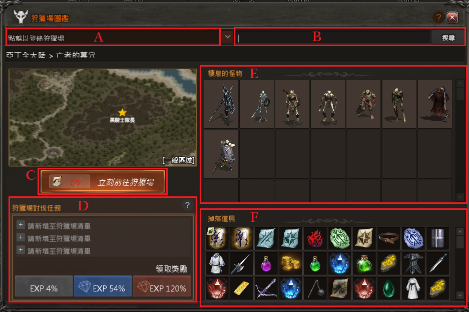 F:顯示該地圖會掉落的道具,也可直接點選怪物顯示怪物的掉落。